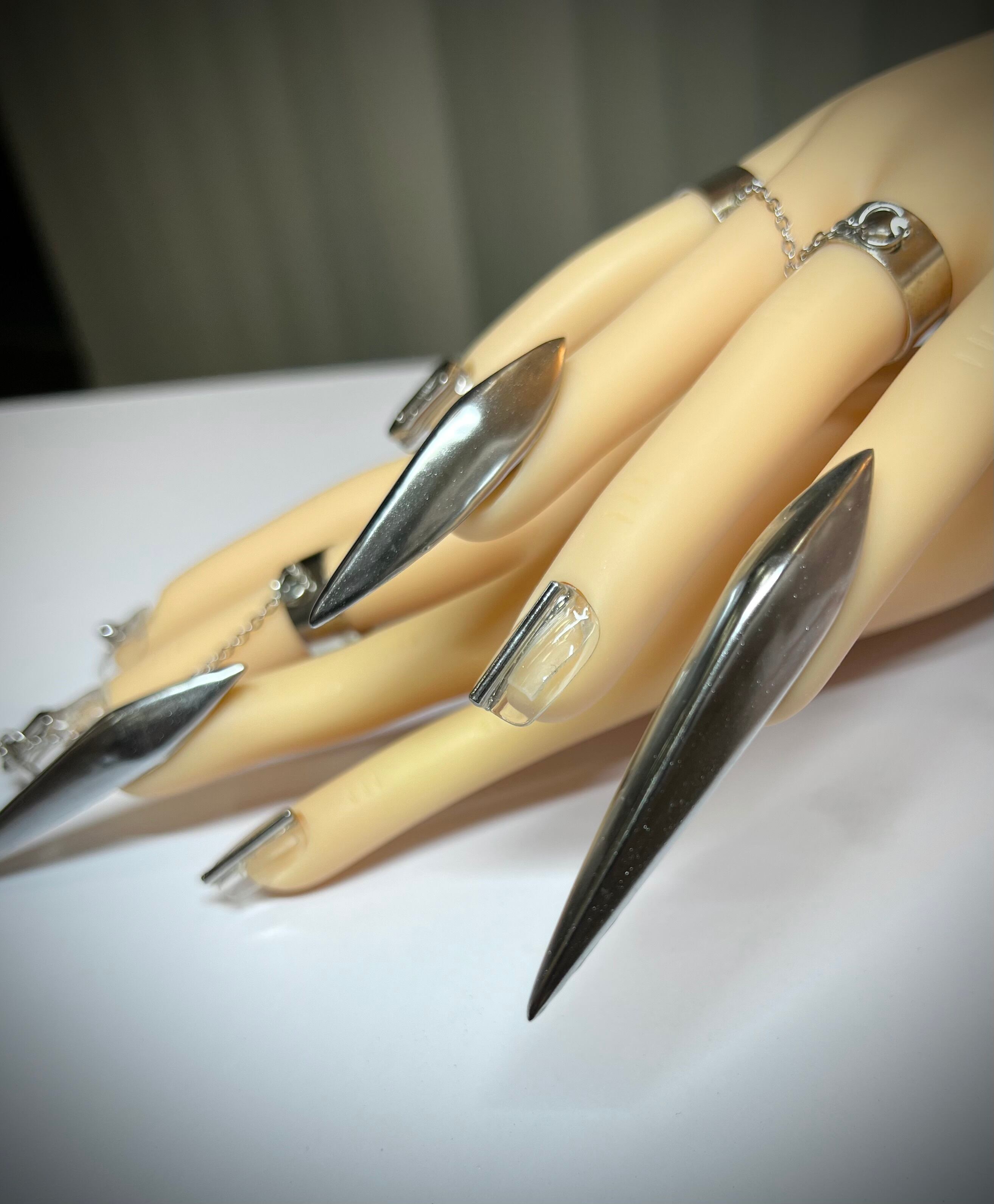 オールネイル素材で作成した金属のように見えるデザイン。とても軽くつけやすくなっています。