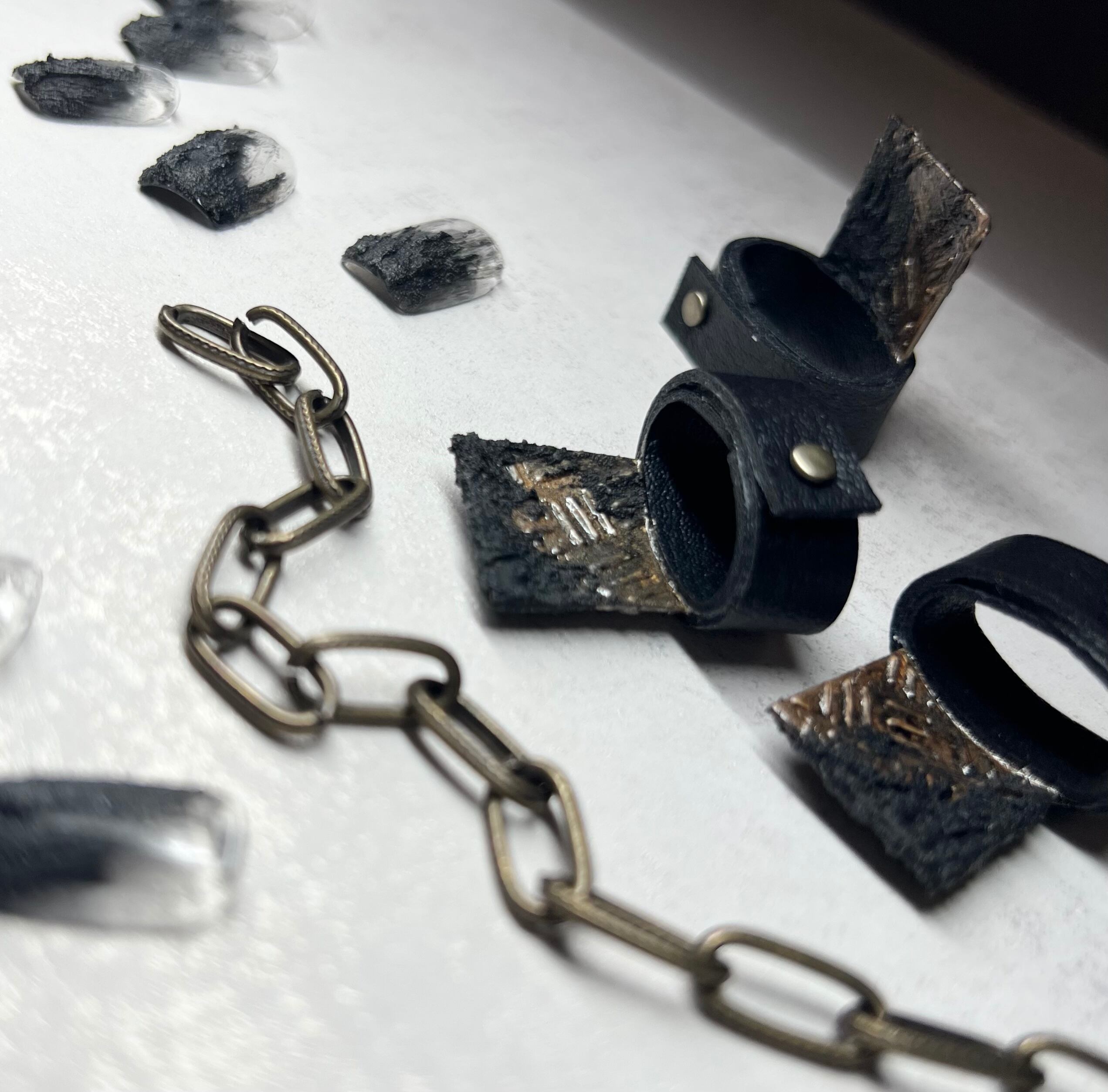 和文化である箏爪に、ハードなブロンズを合わせた。