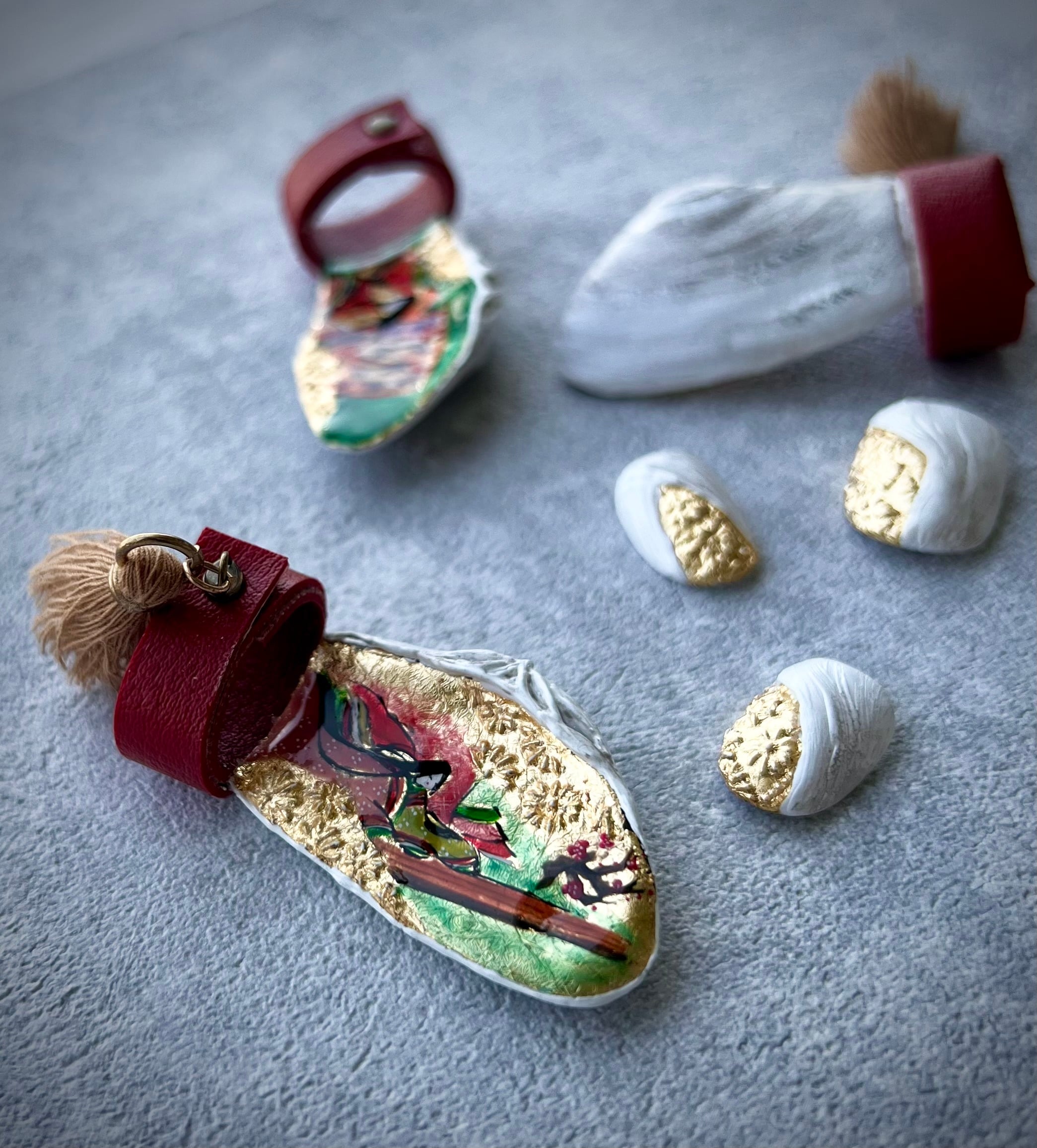 その箏爪を貝合わせの蛤に見立てて源氏絵を描きました。
