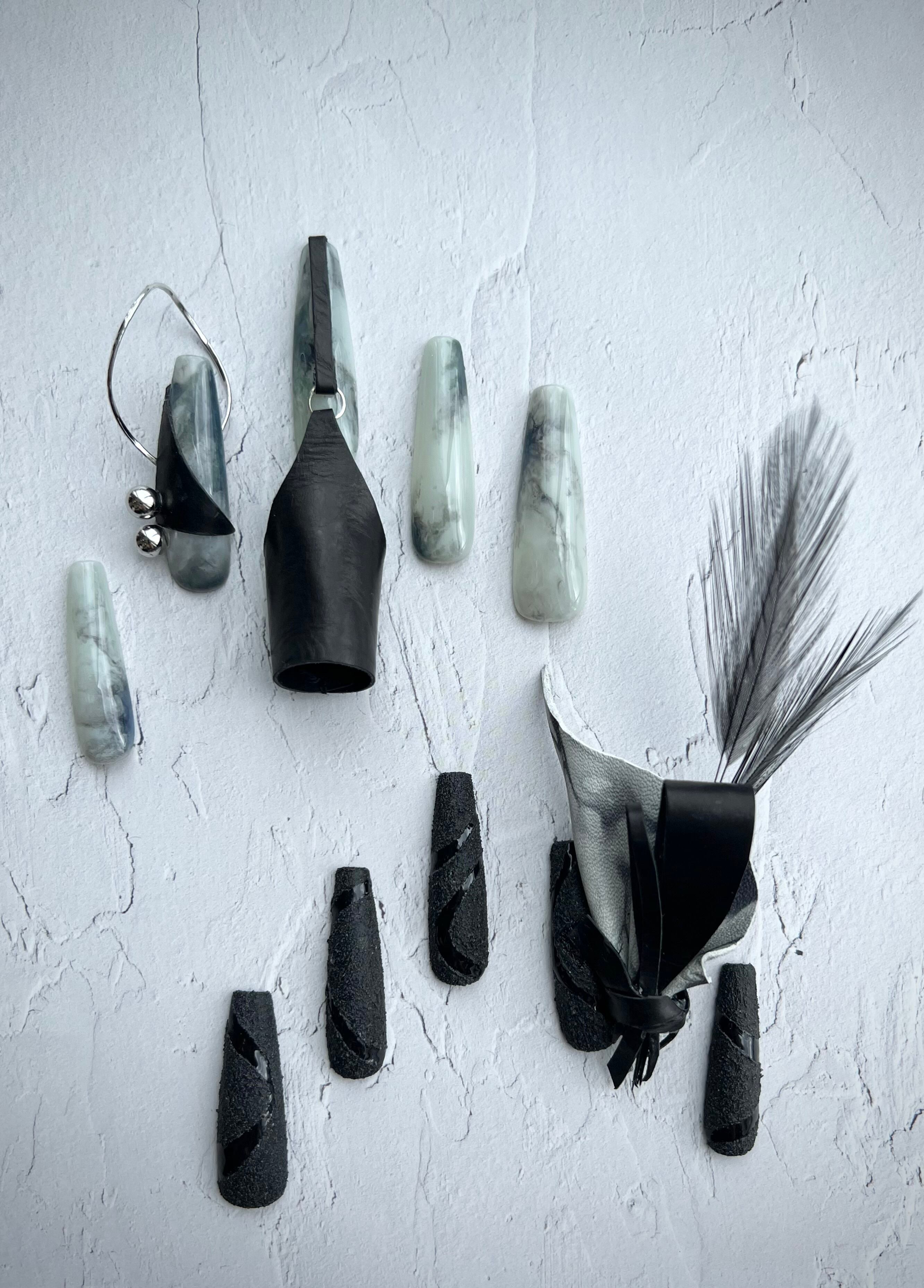 黒の革に羽根とメタル素材を華やかにあしらったネイルは、