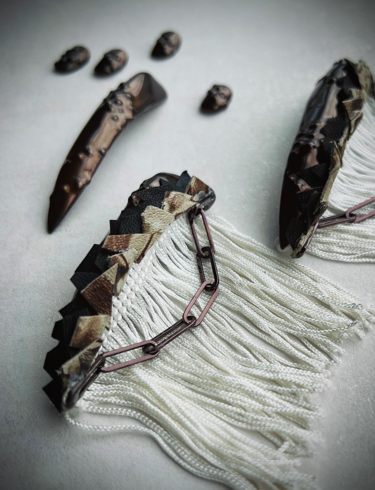 柔らかく揺れる水面のような凹凸を、深い輝きのブロンズ色のミラー加工に、また、カットしたレザーに大胆にフリンジを合わせた。